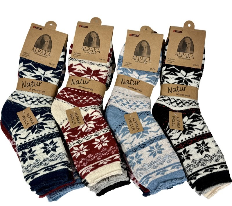 Dámské termo ponožky z alpaka vlny – vločkový vzor pro zimní pohodlí. Objevte hřejivé dámské ponožky z prémiové alpaka vlny s tradičním norským vzorem vloček. Ideální na chladné zimní večery i jako stylový vánoční dárek. Zaručené teplo a pohodlí!