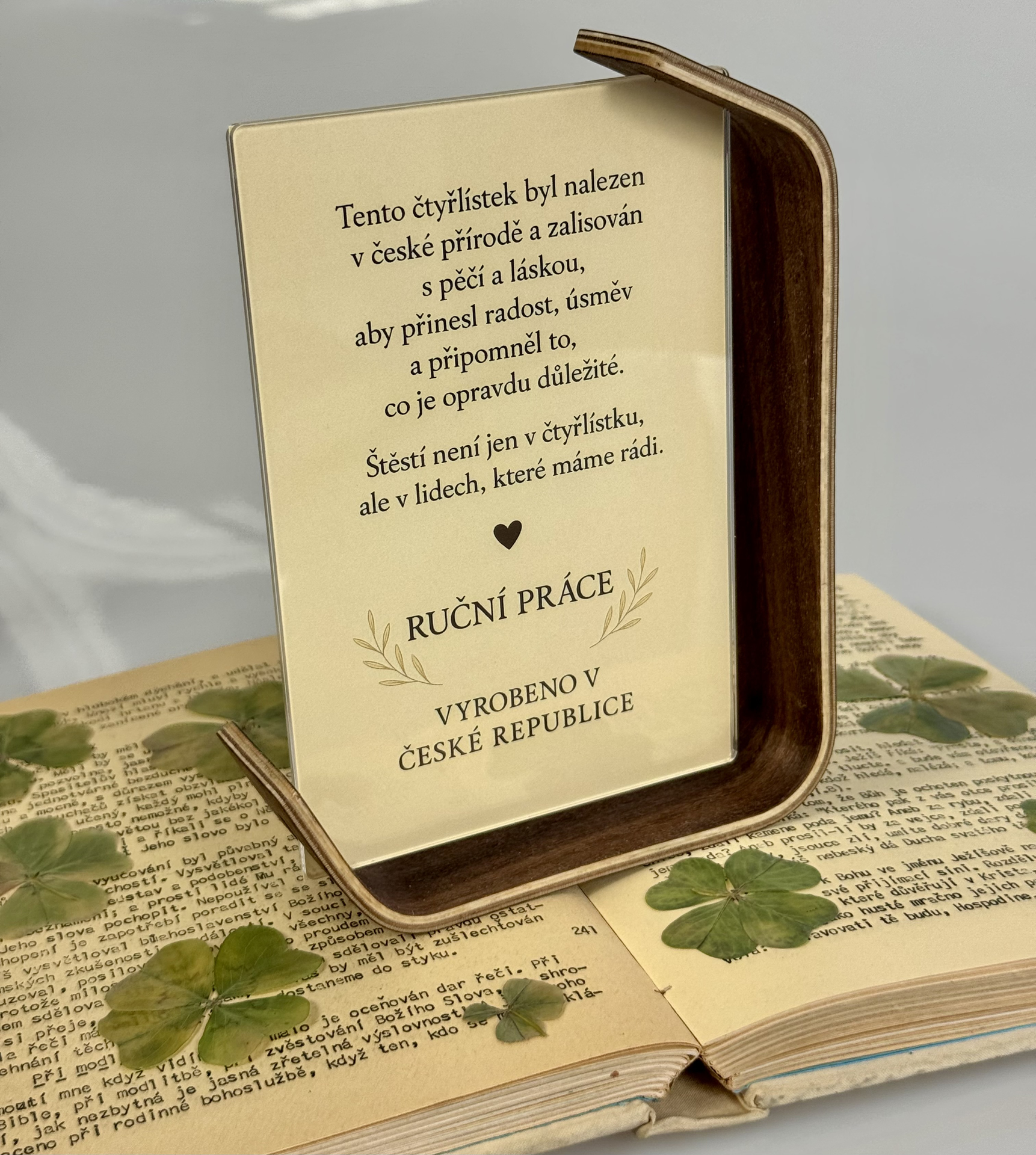 Každý čtyřlístek je skutečný originál, ručně nasbíraný v okolí naší firmy mezi poli a lesy u Prahy. Pečlivě jej dvakrát lisujeme, sušíme a laminujeme, aby si zachoval svou krásu i energii. Tento symbol štěstí v kombinaci s jednoduchými slovy díků probouzí emoce – mnozí se přiznali, že při obdarování měli slzy v očích.