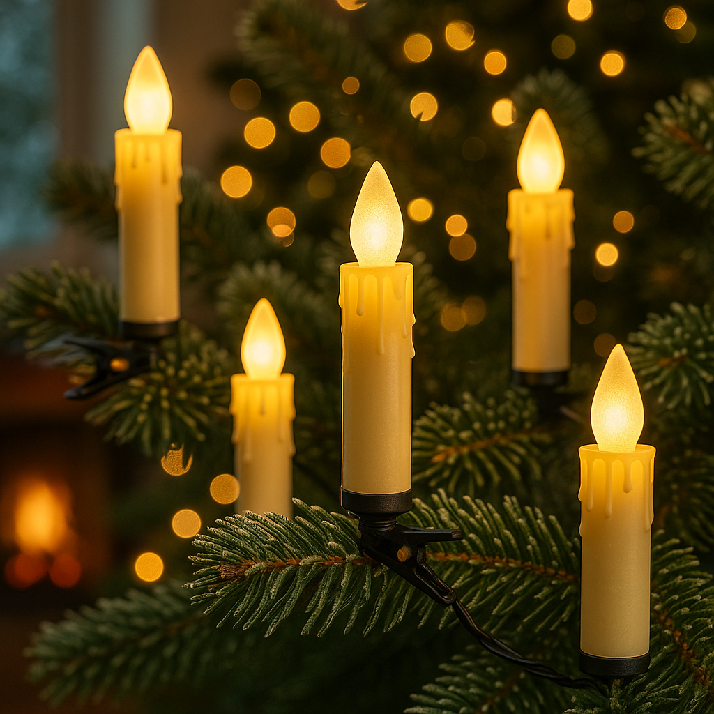 Vraťte na stromek kouzlo klasických svíček – bezpečně a úsporně. Tento řetěz s 20 plápolajícími LED svíčkami svítí příjemnou teple bílou a díky praktickým klipům je uchytíte na větve během chvilky, bez poškození jehličí. Svítící část má 6 m, svíčky jsou od sebe po 30 cm a k zásuvce vede 3 m přívodní kabel – instalace je tedy pohodlná i na vyšších stromcích. LED diody mají velmi nízkou spotřebu, nepálí a zajišťují dlouhou životnost i příjemně realistický „flame“ efekt bez kouře a vosku.